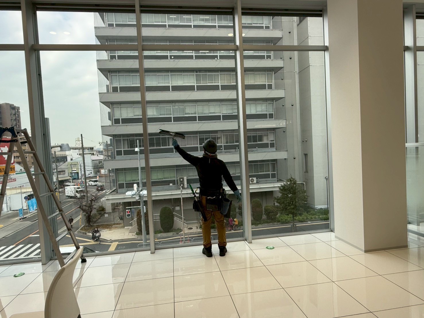 高所ガラスの作業では、まず安全対策をしっかりと整えたうえで、一枚一枚ていねいに仕上げていきます。